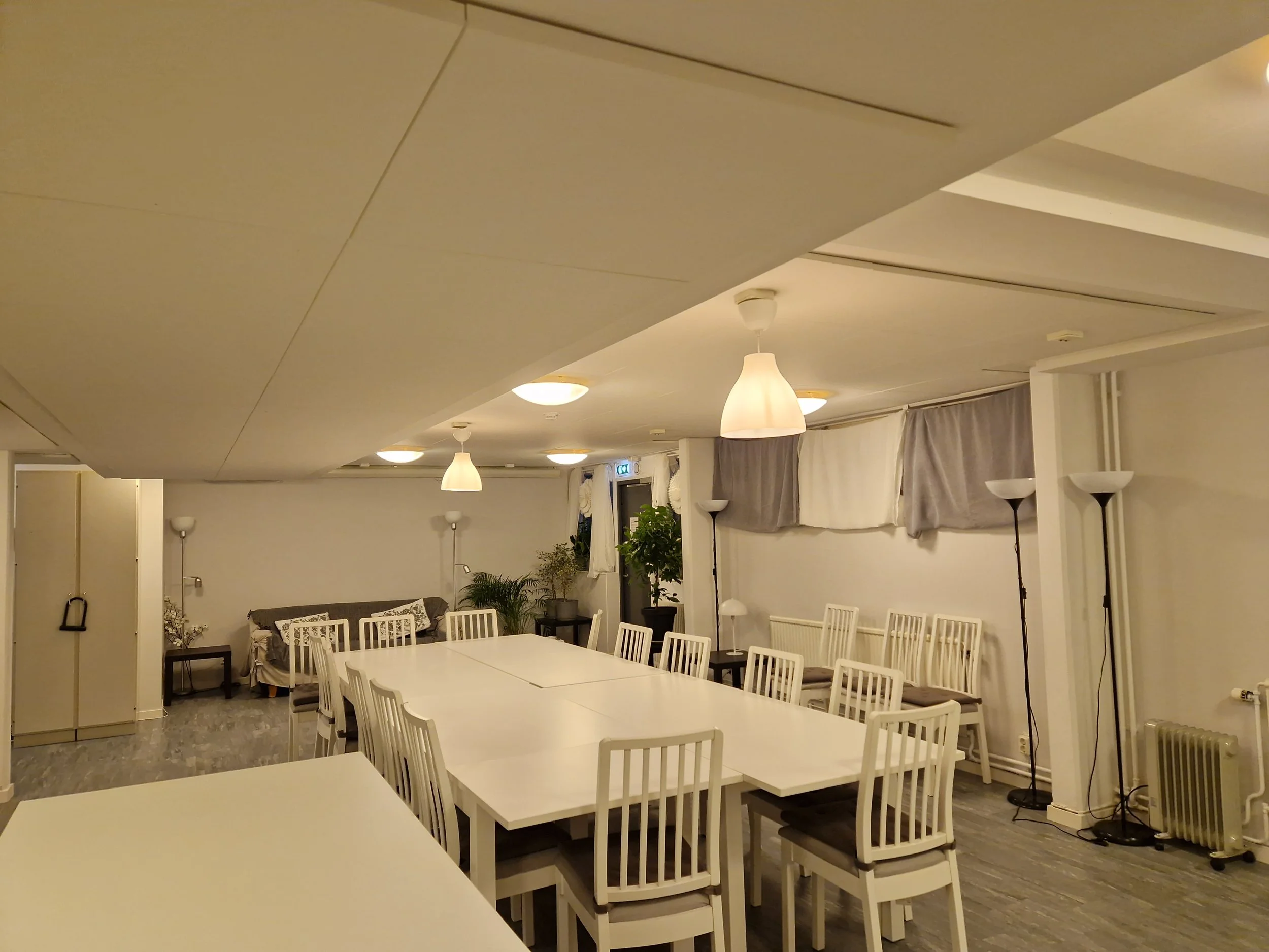 I hus 3/4 hittar du den hyrbara lokalen på Studiegången. Här kan du till exempel fira en födelsedag, men utan alkohol. Om du är intresserad av att låna lokalen, klicka på kontakt och skicka ett sms (innan klockan 20:00) till en av de ansvariga för att få tillgång.